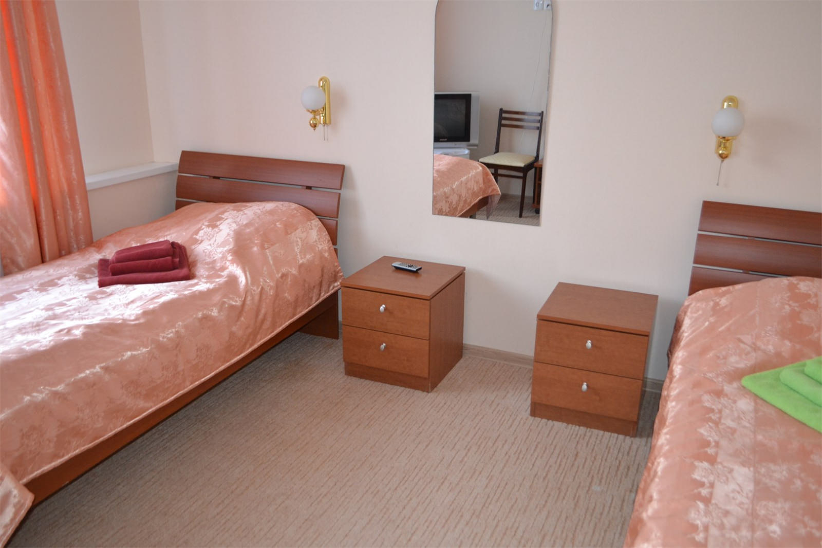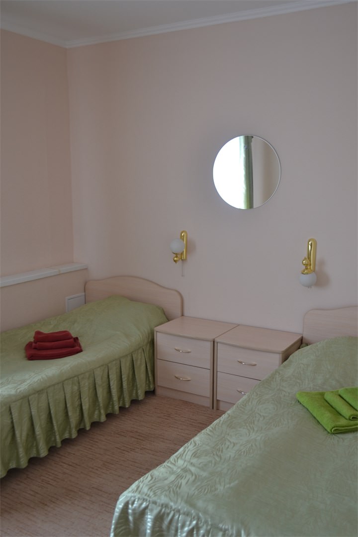Площадь номера - 18 кв.м. 2 осн. места. Мебель: вешалка, зеркало, кровати односпальные (2), прикроватные тумбочки, столик журнальный, стулья, шкаф-купе. Оборудование: набор посуды, телевизор, холодильник. Санузел: с ванной или душевой кабиной, туалетные принадлежности, фен. Сервис: Wi-Fi бесплатно, смена полотенец, смена постельного белья, уборка номера.